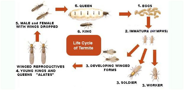Termites hatch from eggs and can go through several life stages to reach maturity. Each termite egg can develop into any member of the termite caste – worker, soldier or reproductive. To make sure the colony has the right balance of termites fulfilling each role, the king and/or queen termite will produce pheromones to control the development of immature termites.
